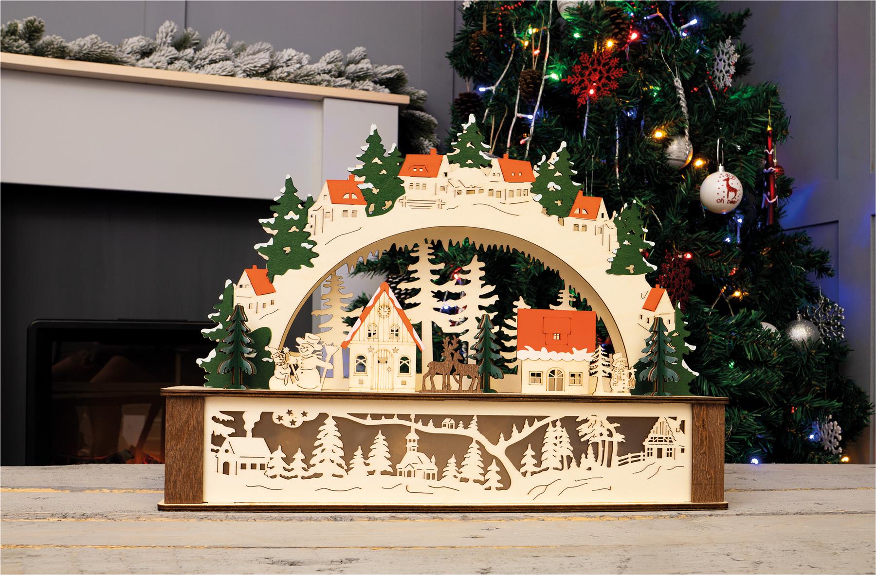 This beautifully crafted festive lighting arch will look perfect on your window sill or table tops, in fact anywhere you want to create a wonderfully festive atmosphere. This LED light arch is a fantastic alternative to traditional Christmas candle bridges. Made from wood sourced from an FSC-accredited manufacturer. The arch features festive carvings such as snowmen, reindeer, Christmas trees, stars and snow-covered houses in natural wood tones and festive oranges and greens .3 of the 8 LED lights are placed within the carvings to create festive silhouettes. The festive arch is battery-operated, simply insert 2x AA batteries (not supplied) and enjoy this festive light in the comfort of your own home.